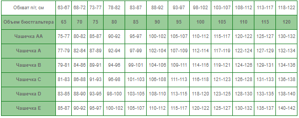 Измерение проводится от грудины через область сосков здоровой молочной железы до центра спины. Умножьте это число на два. Теперь спуститесь от 2 строки таблицы к следующей строке по той же колонке, в которой указан размер бюстгальтера.